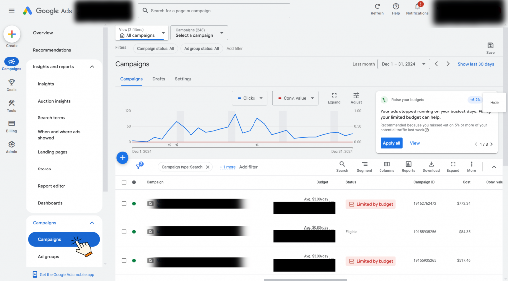 • Impression Share: How often your ads appear versus their potential. A low share suggests room for better visibility.
