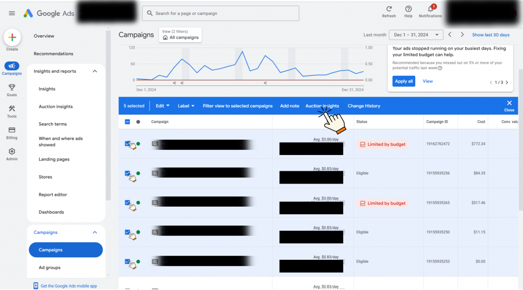 • Select a campaign or ad group and navigate to “Auction Insights” in the top menu.