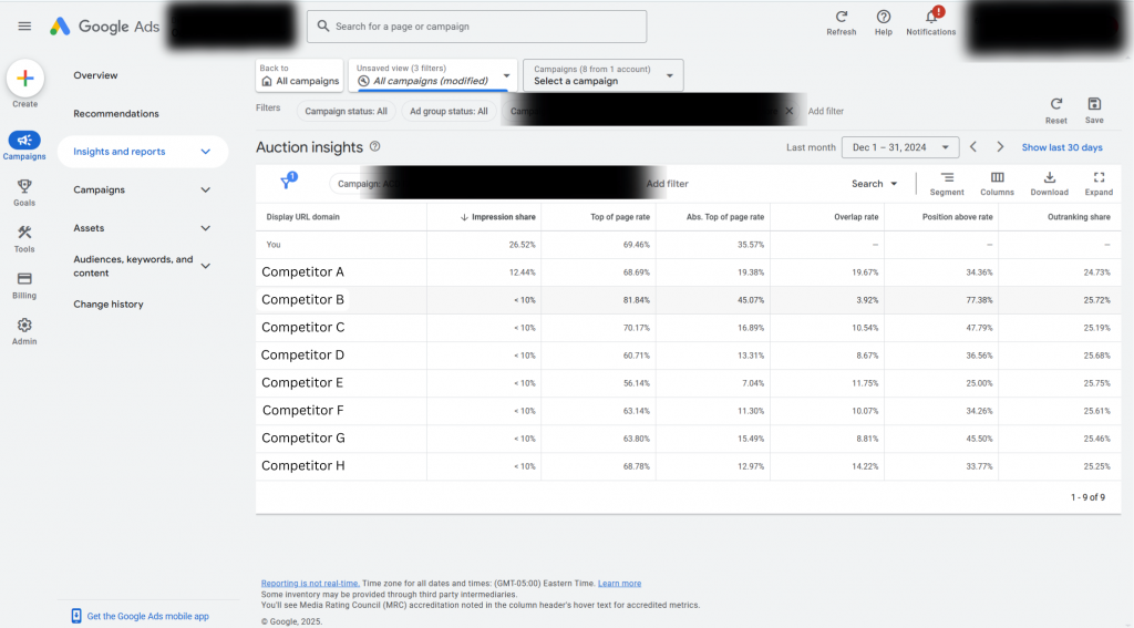 Auction Insights offer a clear comparison of your ad performance against competitors. Key metrics include: